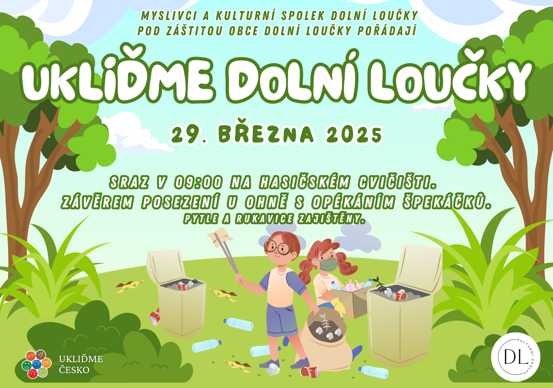 V sobotu 29. března 2025 se již tradičně uskuteční úklid obce Dolní Loučky a okolí. Sraz účastníků v 9 hod. na hasičském cvičišti pod Hradiskem. Závěrem proběhne menší posezení s opékáním špekáčků.