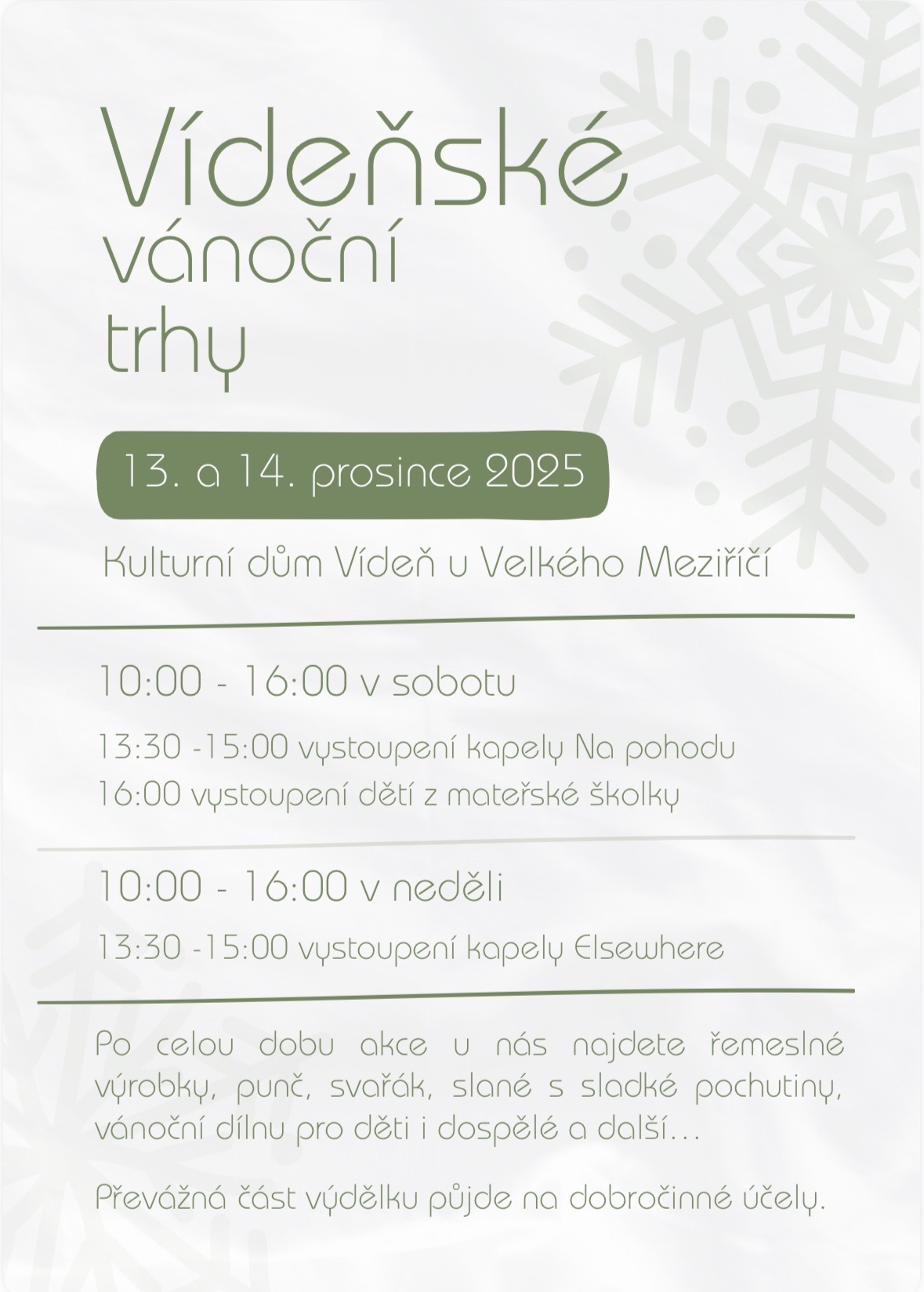 Už o víkendu 13. a 14. prosince 2025 ožije malá obec na Vysočině, Vídeň, Vídeňskými vánočními trhy. Kromě sváteční atmosféry, řemeslných výrobků a pravé vídeňské kávy je hlavním cílem akce pomoc druhým. Letošní výtěžek poputuje dvouletému chlapci jménem Teo.