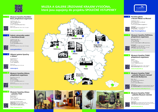 Úplné informace jsou uvedeny v informačních letácích, které jsou k dispozici v základní či rozšířené tištěné podobě a získáte je ve všech zapojených organizacích nebo na krajském úřadu v oddělení kultury. Ke stažení jsou rovněž ve formátu pdf na krajském webu https://www.kr-vysocina.cz/spolecna-vstupenka-muzei-a-galerii-zrizovanych-krajem-vysocina/d-4117870/p1=122962 nebo na webových stránkách dotčených organizací. Součástí rozkládacího letáku je i mapa s kontakty na jednotlivé instituce včetně stručných informací o expozicích. Vstupenku lze využít i k návštěvě výstav.