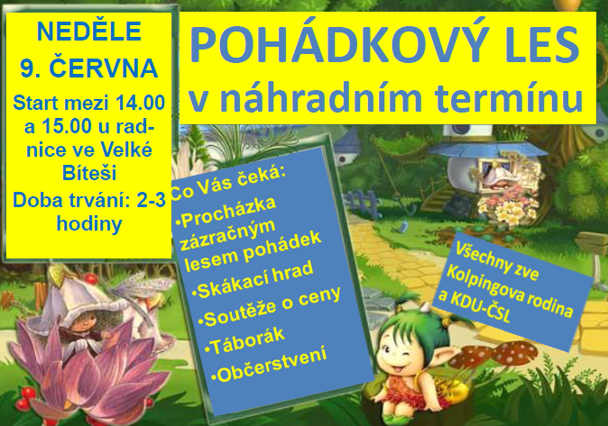 protože počasí nám vůbec nepřeje a předpověď na zítřek je ještě horší, domluvili jsme se na přesunutí Pohádkového lesa. Náhradní datum je neděle 9. června, snad už se počasí do té doby umoudří a my budeme moci obdivovat pohádkové postavy a užít si spoustu legrace.