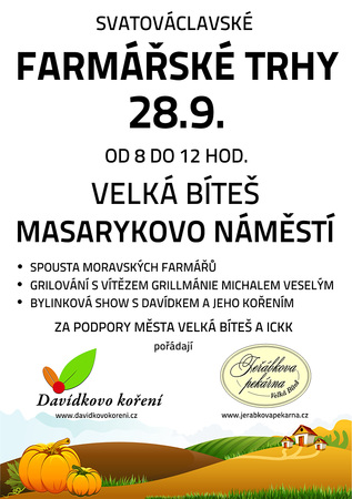 Své potraviny představí spousta moravských farmářů. Proběhne také grilování s vítězem grillmánie Michalem Veselým a bilinková show s Davídkem a jeho kořením. Tuto akci pořádá Davídkovo koření a Jeřábkova pekárna za podpory města Velké Bíteše a ICKK.