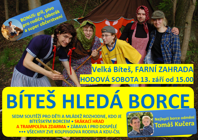 „Osobně se těším na soutěžní klání Bíteš hledá borce. Je to příležitost pro sportovně založené děti a pro rodiny, které spolu chtějí strávit krásné chvilky. A pro rodiny, co mají hlouběji do kapsy, chceme nabídnout dětský program, který je zcela zdarma“ dodává Tomáš Kučera. Děti budou soutěžit na bítešské farní zahradě o hodové sobotě 13. září od 15 hodin. Vrcholem programu bude slavnostní vyhlášení nejlepších bítešských borců, kterým předá odměny rychtář letošních hodů Vítězslav Spurný.