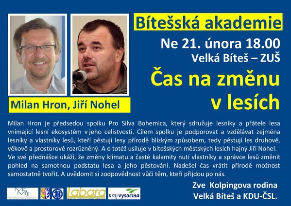 Velká Bíteš a Velkobítešský region se mohou pochlubit velkou rozlohou lesa. Jsou to plíce naší země. A mnohdy jsou to plíce nemocné. Proto Bítešská akademie přináší besedu s dvěma odborníky, kteří se hospodařením v lesích dlouhodobě zabývají. Uskuteční se v neděli 21. února v 18 hodin na Základní umělecké škole. Ve své přednášce ukáží, že změny klimatu a časté kalamity nutí vlastníky a správce lesů změnit pohled na samotnou podstatu lesa a jeho pěstování. Nadešel čas vrátit přírodě možnost samostatně tvořit. A uvědomit si zodpovědnost vůči těm, kteří přijdou po nás.