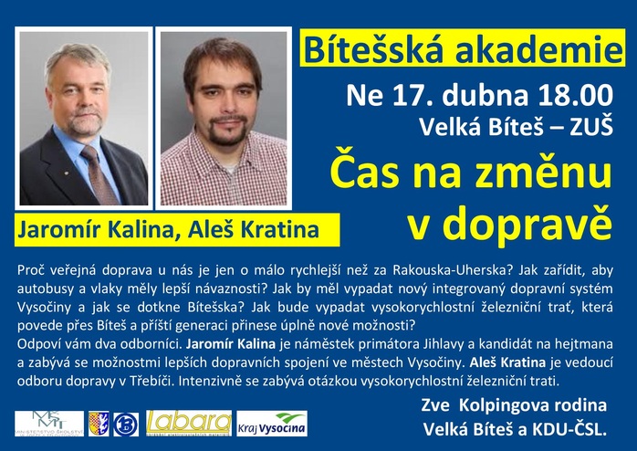 Další beseda Bítešské akademie se uskuteční v neděli 17. dubna v 18 hodin na ZUŠ Velká Bíteš. Bude se týkat ožehavého tématu veřejné dopravy. Zodpoví na otázky, proč veřejná doprava u nás je jen o málo rychlejší než za Rakouska-Uherska? Jak zařídit, aby autobusy a vlaky měly lepší návaznosti? Jak by měl vypadat nový integrovaný dopravní systém Vysočiny a jak se dotkne Bítešska? Jak bude vypadat vysokorychlostní železniční trať, která povede přes Bíteš a příští generaci přinese úplně nové možnosti?