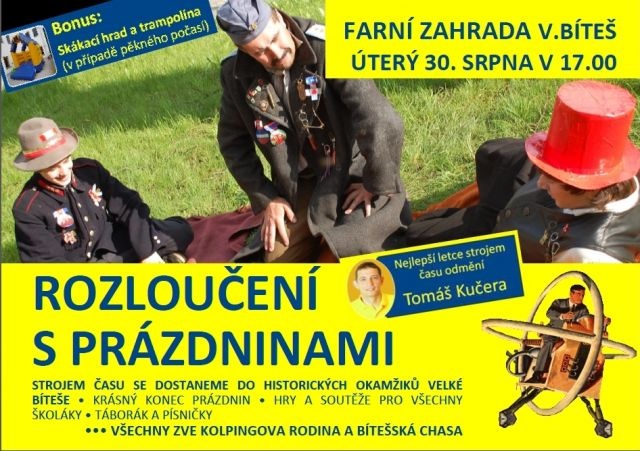 Velkobítešská chasa a Kolpingova rodina srdečně zvou všechny školáky na Rozloučení s prázdninami, které se uskuteční v úterý 30. srpna od 17 hodin na farní zahradě ve Velké Bíteši. Strojem času se dostanete do historických okamžiků Velké Bíteše. Na všechny čekají skákací hrad a trampolína, táborák, hry, soutěže a zábava s kapelou Bridge.