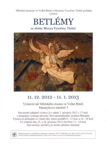 Velká Bíteš - Výstava betlémů s názvem "Beltémy ze sbírky Muzea Vysočiny Třebíč" se koná od 11. prosince 2012 do 11. ledna 2013 v malém sále Městského muzea ve Velké Bíteši.