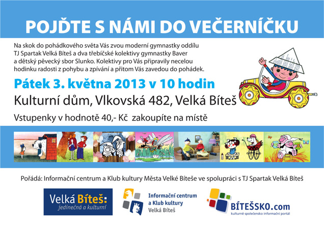 Informační centrum a Klub kultury města Velké Bíteše ve spolupráci s TJ Spartak Velká Bíteš Vás zvou na zábavné dopoledne s pohádkami z Večerníčků.
