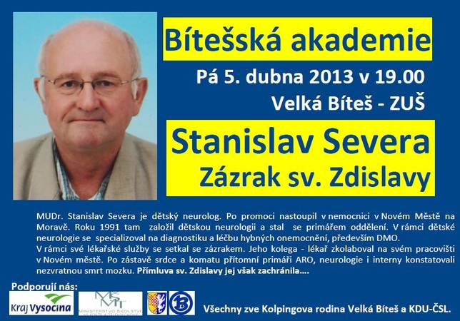 O zázraku na přímluvu svaté Zdislavy, který umožnil před sedmnácti lety její svatořečení, veřejnost mnoho neví. O podobné informace je přitom mimořádný zájem, jak ukázala přednáška ve zcela zaplněném farním kostele sv. Prokopa ve Žďáru nad Sázavou. Když loni v závěru května vyprávěl o svých poznatcích novoměstský lékař-neurolog Stanislav Severa, lidé napjatě sledovali každé jeho slovo. Nyní přichází do Velké Bíteše.