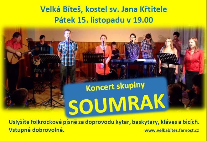 Skupina Soumrak ze Zbraslavi vystoupí v bítešském kostele v pátek 15. listopadu v 19 hodin. Soumrak hraje folkrockovou hudbu inspirovanou převážně biblickými událostmi. V repertoáru má vlastní písně nebo tradicionály vylepšené vlastními texty.