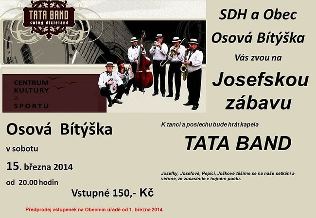 Josefové mají sice svátek až 19. března, ale slavit se bude tradiční zábavou již tuto sobotu 15. března od 20 hodin v Centru kultury a sportu v Osové Bítýšce. K tanci a poslechu zahraje skupina TATA BAND. Vstupenky si můžete koupit v předprodeji na Obecním úřadě v Osové Bítýšce. Vstupné 150 Kč. Těšíme se na hojnou účast nejen Josefů!