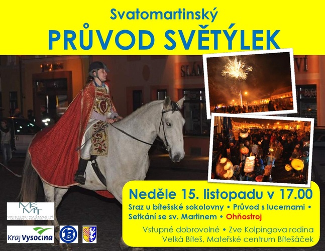 Již tradiční svatomartinský průvod světel ve Velké Bíteši uspořádá v neděli 15. listopadu místní Kolpingova rodina a Mateřské centrum Bítešáček. Průvod rodičů s dětmi vychází v 17.00 od místní sokolovny, odkud se s lucernami a lampiony vydá směrem na náměstí. Po cestě se dětem ukáže svatý Martin na bílém koni, který jim předá své poselství. V cíli trasy na Masarykově náměstí na všechny čeká ohňostroj, který připravil bítešský ohňostrojař pan Janeček.