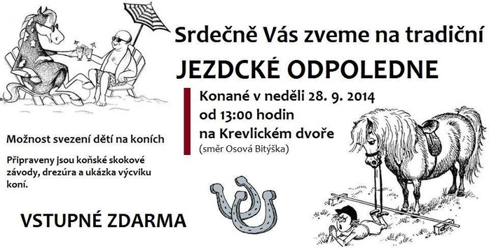 Jezdci i diváci jsou již tuto neděli srdečně zváni na tradiční Jezdecké odpoledne v Krevlicích. Akce se koná od 13 hodin na Krevlickém dvoře. Jezdci se mohou přihlásit na e-mailu: aura-bites@seznam.cz. Výška skoků je 60 cm, 80 cm a 100 cm. Těšit se můžete na koňské skokové závody, drezůru a ukázku výcviku koní. Pro děti jsou připraveny projížďky na koních. Vstup je zdarma.